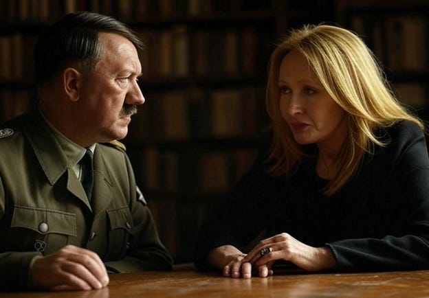 There’s an extremely censorious assertion of this ideology, a kind of holy war belief that debate and discussion of these issues is harmful in itself, and that we apostates must be shut down at all costs, silenced, doxed, dis-employed, barred, and exiled. It is absolutely essential that this trend be confronted and reversed. The following is a phony picture of J. K. Rowling in a meeting with Hitler. It was generated by those who call her a bigot because she makes the simple claim that a man cannot be transformed into a woman or vice versa. She has never engaged in hate speech, or incited others to harm anyone with whom she disagrees. Her politics is center-left. She writes popular kids’ books and adult detective novels.